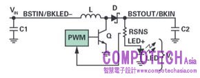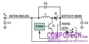 LED驅動器最常用的拓撲是升壓應用,它可能用於VIN < VF的12 V輸入電源軌供電的LED陣列。圖1所示為一升壓解決方案,圖2所示為方框圖。輸入電壓連接到BSTIN/BKLED–終端,LED燈串的陰極連接到GND。當電晶體Q導通時,電流在電感L中積聚。一旦Q關斷,L上的電壓就會改變極性,電感電流開始流向輸出濾波電容C2。LED調光在PWM部分實施,這調節了工作週期,乃至平均LED電流(由電阻RCLR設定)。電容C1是輸入電壓濾波器。