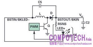 在許多商用、電池和太陽能供電應用中,輸入電壓變化範圍很廣。在這些情況下,最合適使用圖4所示的升降壓拓撲。輸入電壓和LED陰極連接到BSTIN/BKLED–終端。當電晶體Q導通時,電流在電感L中積聚。一旦Q關斷,L上的電壓就會改變極性,使二極體D正偏,同時電壓攀升超過輸入位準。PWM使流經LED和C5的電流保持在設定值不變,C2充當輸出濾波器。LED燈串電壓VF可以低於或高於VIN。