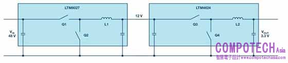 圖2.電壓分兩步從48 V降至3.3 V,包括一個12 V中間電壓。