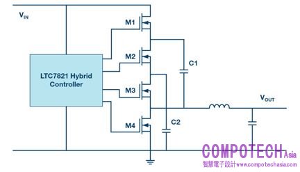 電荷泵和降壓拓撲的組合具有以下優點。由於電荷泵和同步切換開關穩壓器的優化組合,轉換效率非常高。外部MOSFET M2、M3和M4只需承受低電壓。電路也很精小。相較於單級轉換器方法,電感更小且更便宜。對於該混合式控制器,開關M1和M3的工作週期為D = 2×VOUT/VIN。對於M2和M4,工作週期為D = (VIN – 2 × VOUT)/VIN。