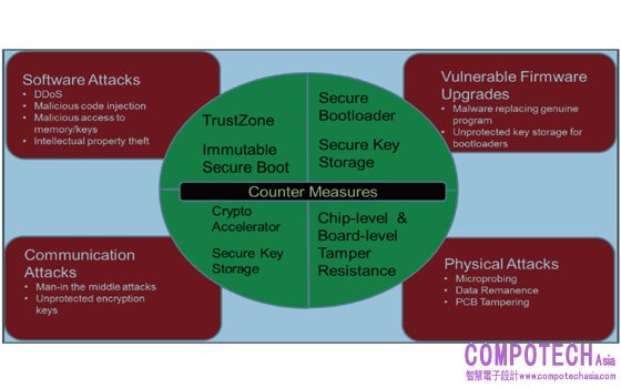 圖:IoT 節點面臨的物理和遠端的安全威脅,以及其各自的反制措施(Counter Measures),這些措施內建於嵌入式系統中以防止攻擊。