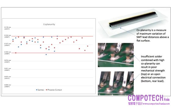 圖: 共面度是指在一個平面上測量到的不同引線高度之間的最大差值;對表面貼裝(SMT) 器件的引線而言,將該項差值降至最低至關重要,借此可以避免焊點出現問題。( 右下角)。