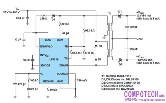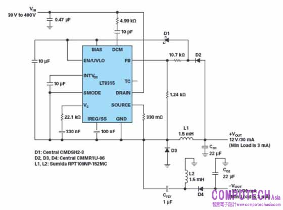 圖3.使用單個LT8315 IC的非隔離型雙電感降壓轉換器的原理圖:從30 V至400 V輸入轉換至±12 V輸出(每路30 mA)。