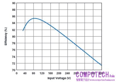 圖2.圖1所示反馳式轉換器的滿載效率與輸入電壓的關係。