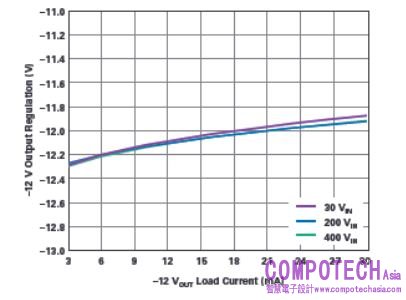 圖4.圖3所示雙電感降壓轉換器在各種輸入電壓下的負12V負載調整曲線。