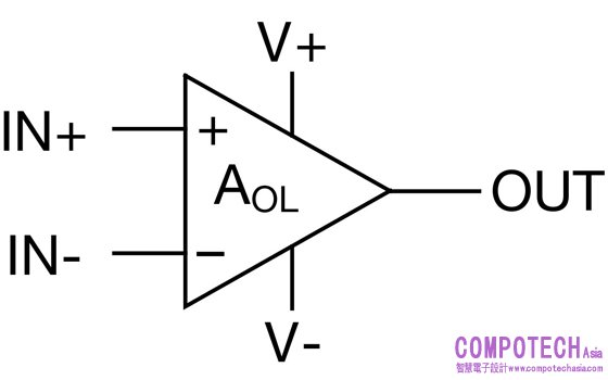 圖1描述了運算放大器的標準示意圖符號。有兩個輸入端(IN+, IN-)、一個輸出端(OUT)和兩個電源端(V+, V-)。這些端的名稱可能因製造商而異,甚至單個製造商也可能使用不同的名稱,但它們仍然是相同的五個端。