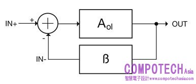 圖2描述了作為回饋控制系統一部分的運算放大器。您會注意到輸出OUT通過一個標記為ß的塊回饋到負輸入IN-。ß被稱為回饋因數,通常使用電阻來降低輸出電壓。