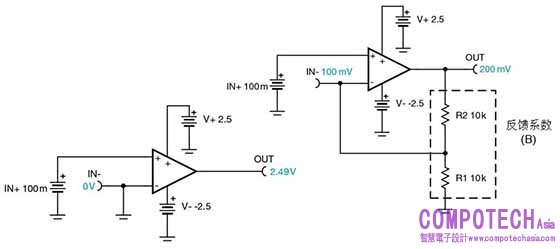 圖3比較了開環運算放大器和負反饋運算放大器。這些TINA-TI™軟體模擬電路採用的運放是近乎理想的運放,加了電源來限制輸出電壓。注意,對於左側的開環配置,輸出幾乎等於正電源(V+)。這是因為輸入引腳之間有一個很小的差異(100mV)。這種小電壓被開環增益放大,開環增益會強制輸出到其中一個電源電壓。在圖3右側的負反饋或閉環電路中,運算放大器輸出上的分壓器需要200 mV的輸出電壓,以便使反相和同相輸入相等。
