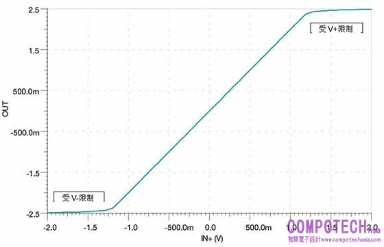 運算放大器的輸出受到電源電壓的限制。圖4是圖3中同相放大器的輸出電壓與輸入電壓的關係圖。注意當輸出接近正負電源時,輸出由於飽和受限。