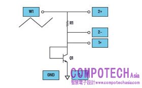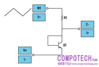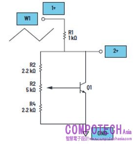 實驗室硬體電源將可用的最大電壓限制為小於10V。許多電晶體的發射極-基極反向擊穿電壓都大於此電壓。在圖6所示的配置中,可以測量0 V至10 V(W1峰峰值擺幅)之間的電壓。