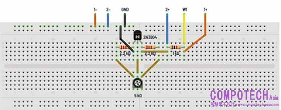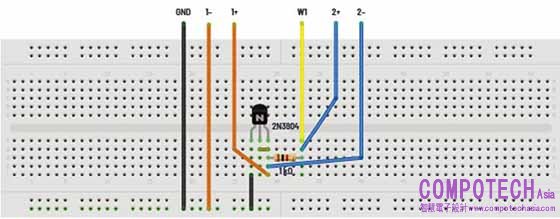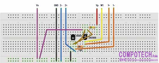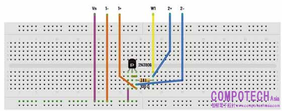 圖9.降低二極體有效正向壓降的麵包板電路。