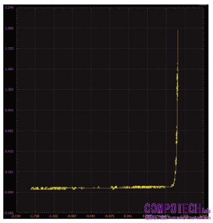 將捕獲的資料載入到試算表中,計算電流。繪製電流與電晶體兩端電壓(VBE)的曲線,無反向流動電流。在正向導通區域,電壓-電流呈對數關係。如果在對數坐標系中繪製電流曲線,結果應為直線。