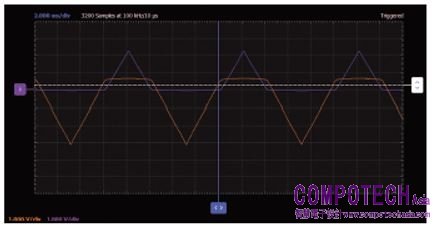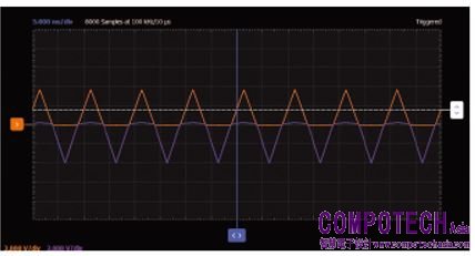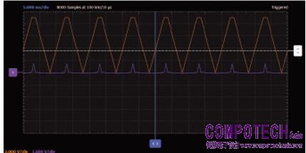 波形產生器配置為100 Hz三角波,峰峰值幅度為6 V,偏移為0 V。示波器的差分通道2(2+、2-)用於測量電阻(和電晶體)中的電流。連接示波器通道1 (1+)用於測量電晶體兩端的電壓。流過電晶體的電流是1+和1-之間的電壓差除以電阻值(1 kΩ)的結果。