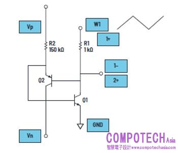 連接麵包板,將波形產生器W1連接到串聯電阻R1的一端以及NPN Q1的集電極和PNP Q2的基極,如圖8所示。Q1的發射極接地。Q2的集電極連接到Vn (5 V)。電阻R2的一端連接到Vp (5 V)。R2的另一端連接到Q1的基極和Q2的發射極。示波器通道2 (2+)的單端輸入連接到Q1的集電極。