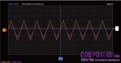 波形產生器配置為100 Hz三角波,峰峰值幅度為10 V,偏移為0 V。示波器通道1 (1+)用於測量電阻兩端的電壓。其設定應配置為將通道2跨接到電阻R1的兩端(2+、2-)。兩個通道均應設定為每格1 V。流過電晶體的電流是2+和2-之間的電壓差除以電阻值(100 Ω)的結果。