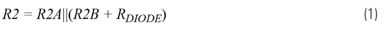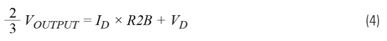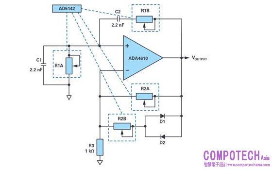 所以,變數ID和VD分別代表通過D1和D2的二極體正向電流和二極體正向電壓。如果R2B出現短路,會產生約±0.6 V的振盪幅度。R2B的幅度量級正確時,則可達到平衡,從而使VOUTPUT收斂。在圖1所示的電路中,R2B採用了一個單獨的100 kΩ digiPOT。