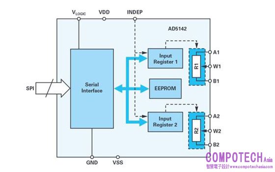 D表示AD5142中可編程數字代碼的十進位等效值,RAB表示電位器的總電阻。
