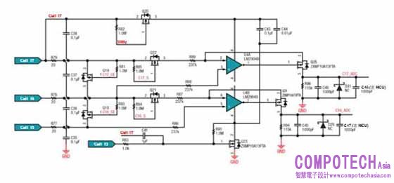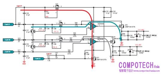 圖5顯示了主要的電流路徑。紅色表示通用運算放大器的電源路徑,綠色表示第17串電池的電壓採樣路徑,灰色表示第16串電池的感測路徑。通用運算放大器的供電電流由整個電池組提供並流回參考地,因此是對整個電池組放電,並不會導致不均衡。第17串電池的電壓採樣路徑也是從整個電池組流回參考地,因此也不會導致不均衡。但是第16串電池的電壓採樣路徑從低16串電池流回參考地,這將導致第17串和低16串電池之間出現電壓不均衡。這種不均衡只有在檢測第16串電池電壓時才會出現。