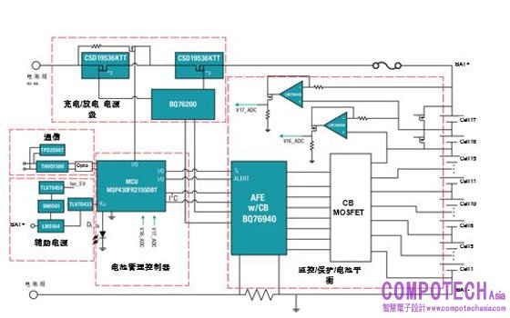 低電流損耗16S-17S電池組參考設計可以幫助解決以上提到的設計難題。它使用BQ76940電池監控器用於電池組低15串電池電壓採樣監控,使用一個雙通道通用運算放大器LM2904B監控高兩串電池電壓。通過外部金屬氧化物半導體場效應電晶體(MOSFET)實現更大的電池均衡電流。電池組參考設計的框圖如圖1所示。