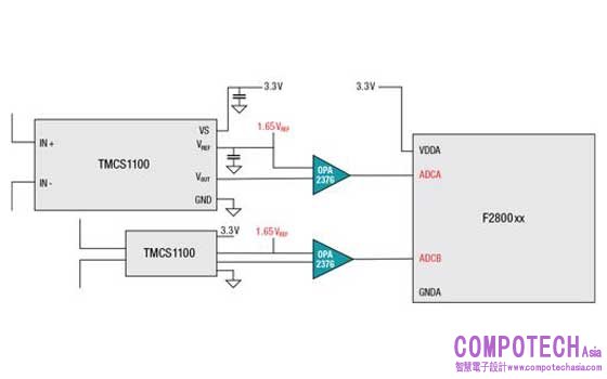 圖1展示了,在分別使用3.3 V和5 V供電情況下,霍爾效應電流感測器的典型應用電路。與使用3.3 V電源供電相比,使用5 V供電可用拓寬霍爾感測器的電流檢測範圍。以TMCS1100A1為例,霍爾感測器的靈敏度為50 mV/A:如果使用3.3V電源,則電流檢測範圍為-33 A〜+ 33 A(雙向);而使用5.0V電源時,電流檢測範圍可以擴展到-50 A〜+ 50A。另外,在設計中應當注意,除了電流檢測範圍之外,還需要考慮感測器的連續電流耐受能力,當電流耐受力不足時,可以通過改善感測器的散熱來優化。