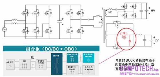 如圖3所示,OBC和高電壓DC/DC轉換器都連接到高電壓電池,因此車載充電器和高電壓DC/DC的全橋額定電壓相同,使得車載充電器和高電壓DC/DC的全橋共用電源開關成為可能。