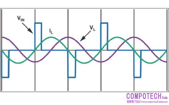 圖: 工作週期低於50%、具有方波輸入的AutoResonant LC 電路電壓和電流波形。
