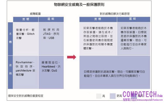 最近Mirai、Meltdown/Spectre、Roca、 Heartbleed及 Rowhammer等知名的攻擊手法,讓 各界對物聯網未來發展的信心蒙上陰影。前述攻擊 不但可能造成財務影響,也可能威脅生命,因為物 聯網裝置不僅負責感測環境,也會在其中實際運作。 例如物聯網裝置可能會依據血糖機等其他物聯網裝 置測量的血糖濃度,在人體運作胰島素幫浦。