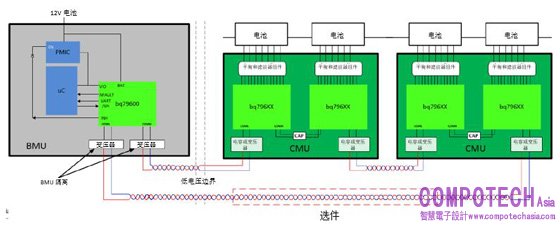 圖2:採用德州儀器 BQ796XX電池監測器系列的菊輪鍊配置示例