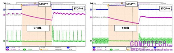 當然,在系統進行時,重要的是在器件的輸出電壓達到系統臨界電平之前重啟器件。一旦將邏輯低電平施加到STOP管腳,調壓器將立即恢復開關操作,而不會有任何啟動和/或軟啟動延遲。圖2說明用於以脈衝頻率調製(PFM)(圖2a)或強制脈衝寬度調製(PWM)(圖2b)操作DC/DC轉換器的STOP特性。