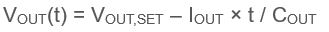 在STOP模式下進行無雜訊測量/RF通信事件的所需時間取決於設置的輸出電壓VOUT,SET、輸出電容值COUT、所需的輸出電流IOUT和應用的電壓容限。在圖2的示例中(VIN = 3.6 V,VOUT,SET = 1.8 V,IOUT = 10 mA, COUT = 10 µF),在時間t = 38 µs之後達到約50 mV的壓降。如果恒定輸出電流IOUT對輸出電容器COUT放電,則可使用公式1估算STOP模式下的輸出電壓行為VOUT(t)作為時間t的函數: