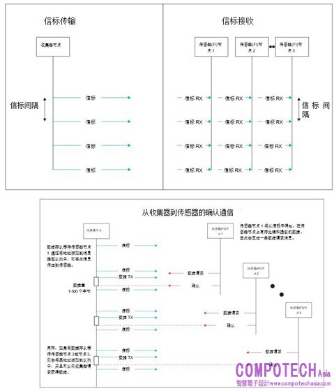 有兩種用於管理資料發送(TX)和接收(RX)的模式:信標模式和非信標模式。在非信標模式下,感測器節點始終處於接收模式,因為沒有定義資料收集器可以與之通信的時間,這會轉化為更高的電流消耗(約5 mA)。除了根據節點之間的距離優化傳輸功率水準外,信標模式通信(見圖2)最適合,因為它可以在感測器節點上實現喚醒模式和睡眠模式之間的占空比迴圈,以幫助在收發器關閉時節省電源。