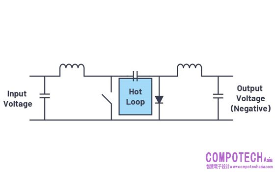 最重要的是,所需的兩個電感分別代表成本和空間因素。但是,這兩個元件也導致輸入端和輸出端的電源路徑中產生電感。這可以防止在輸入端和輸出端產生快速切換開關電流。因此,Ćuk拓撲通常被視為特定的低雜訊拓撲。當然,和其他切換開關穩壓器一樣,Ćuk拓撲也提供切換開關電流。在圖1中,它們表現為熱迴路(藍色)。熱迴路指的是一組具有快速di/dt瞬變的軌跡。為了最大限度降低切換開關電流產生的干擾,以及伴隨的寄生電容,此回路佔用的空間面積必須盡可能達到最小。