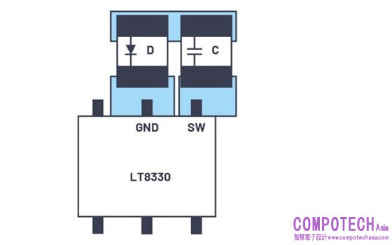 關鍵迴路由外部二極體D、耦合電容C,以及LT8330切換開關穩壓器IC中的GND和SW針腳之間的內部連接構成。熱迴路應儘量短小和緊湊。