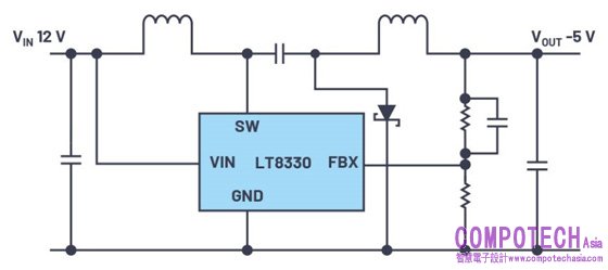 圖3所示為包含LT8330的電路示例,它在Ćuk拓撲中可以當做穩壓器。一個重要的特性就是FBX針腳,這是一種特殊的FB針腳,可以處理負電源電壓(根據Ćuk拓撲的要求)和正電源電壓。如果LT8330用於升壓或SEPIC拓撲中,則需要具備正回饋針腳極性。