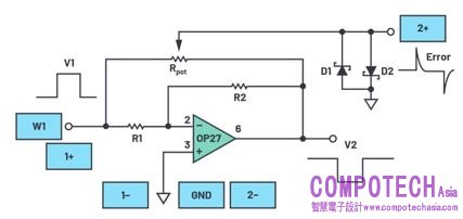 組建如圖2所示的測試電路。記得為運算放大器供電,正5V接到Pin 7,–5 V接到Pin 4,0.1 µF電容用來解除Vp 與Vn電源供應器的耦合。由於這樣的配置是在反相(inverting)模式運作,因此可用來量測運算放大器的安定時間。假值求和節點中的訊號(電位計的滑動片)代表輸出與輸入訊號之間的差異,再乘以常數k,即是誤差訊號。