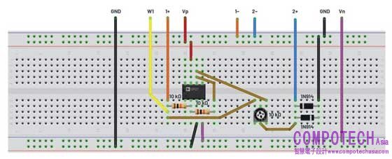 圖3. 量測運算放大器安定時間的麵包板電路