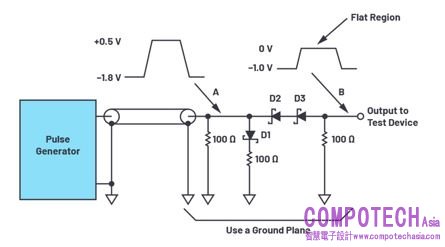 如果D1、D2、D3採用低電容蕭特基二極體,那麼圖5的電路就會有最好表現,所有接點的導線長度都得以縮減。較短的50歐姆同軸線可用來連結脈衝產生器與電路,但若測試組件直接連到產生器的輸出端,則能得到最好的結果。脈衝產生器調整成能在A輸出正向脈衝(如圖5所示),在不到5奈秒內從大約負1.8V上升到正0.5V(假設受測元件的安定時間約20奈秒)。較短的上升時間可能產生振鈴效應,而較長的上升時間則會減損受測元件安定時間的性能,因此實際電路需要進行最佳化調校,藉以達到最佳效能。當脈衝產生器在A處的輸出超過0V,D1就會開始導通,D2/D3則反向偏壓。元件輸入端訊號B的0V區域在測試時呈現平坦波形,D2-D3串聯元件的漏電流與雜散電容的效應不會顯現出。D1二極體以及其100歐姆電容在A點的脈衝時間,則協助維持約50 歐姆的終端電阻。