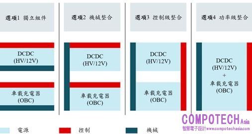 • 選項 2 : 可細分為兩個種選擇,一是共用 DC/ DC 和車載充電裝置的機械外殼,但拆分獨立的冷卻系統;另外是共用外殼和冷卻系統,此為最常見的選擇。