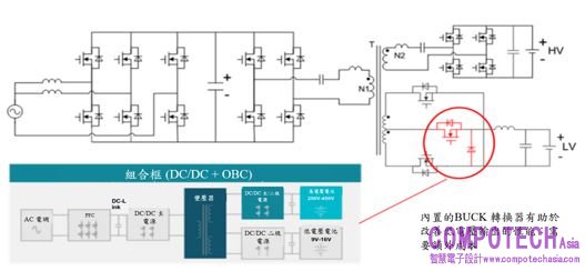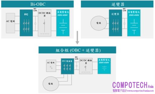 如上圖所示,OBC 和高電壓 DC/ DC 轉換器都連接到高電壓電池,因此車載充電器和高電壓 DC/ DC 的全橋式額定電壓相同,讓車載充電器和高電壓 DC/ DC 的全橋可與功率開關相互共用。