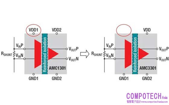 為解決這一設計難題,我們開發了一系列可使用低側電源工作的隔離放大器和ADC。圖1所示為需要兩個電源(左)的標準隔離轉換器和可使用單電源(右)工作的AMC3301系列之間的差異。