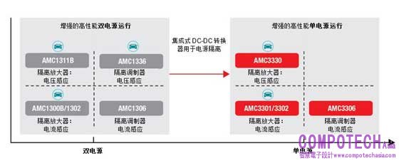 圖2總結了TI的隔離放大器和ADC產品組合。左側所示為需要雙電源的傳統器件;右側所示為單電源工作的器件。