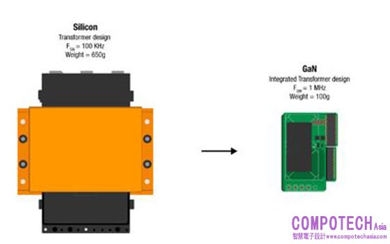 圖1:矽設計與GaN設計的磁性元件功率密度對比