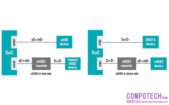當工藝節點為7nm及以上時,USB 2.0可繼續集成到 SoC中,而當工藝節點為5nm及以下時,eUSB2則更適合集成到SoC中。如圖1所示,eUSB2還可集成到其他器件中,從而作為器件間介面與SoC輕鬆互連。USB 2.0將繼續作為標準連接器介面。