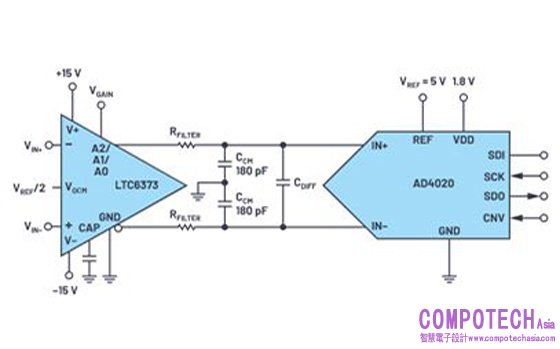 圖1中的電路顯示了使用LTC6373來驅動精密ADC的範例,ADC是具有1.8 MSPS的20位解析度的 AD4020。