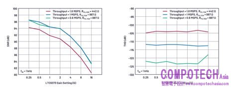 圖2. 使用LTC6373驅動AD4020的SNR(左)和THD(右)性能。