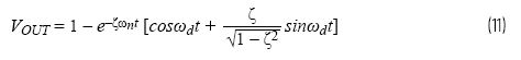 透過公式11,我們可以看出圖1的電路如何響應階躍輸入。我們可以看到,波形具有與正弦曲線類似的特性,其幅度則由e–ζωnt項調變,根據阻尼係數是正數或複數出現指數式衰減或增加。我們可以看到響應由正弦部分和餘弦部分組成,但是,阻尼系統較低時,正弦部分非常小。