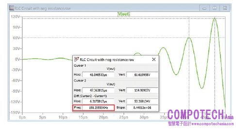 阻尼係數為-0.1時,振盪的實際頻率為994987 rads–1 (158.3 kHz)。