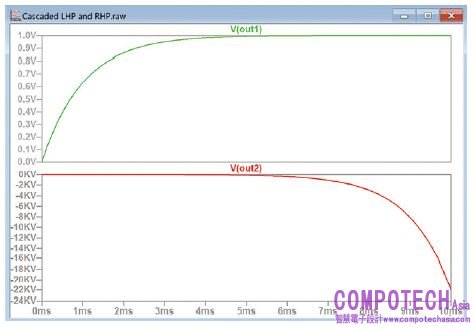 頂部波形在大約5毫秒後穩定在零梯度,這符合大眾接受的規則,即RC電路將穩定在大約5個時間常數。相反,V(OUT2)的梯度不斷增加。現在可以明顯看出,如果將極點位於左半面的電路和極點位於右半面的電路串聯,那麼整個電路會不穩定,這是因為在左半面電路穩定很長時間後,右半面電路的響應會繼續呈指數上升。因此,為了讓電路穩定,所有極點都必須位於左半面。