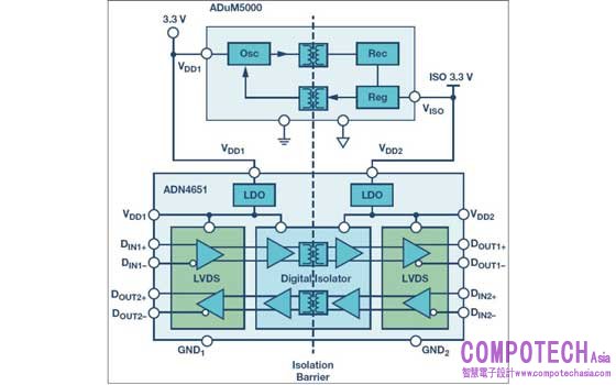 圖 1: 採用 ADN4651 和 ADuM5000 的隔離 LVDS 介面