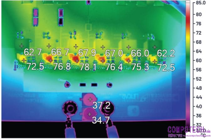 圖1所示為1個6相1.0 V/200 A LTC7852轉換器,其切換頻率為400 kHz,採用12 V輸入。每個相位的功率級包含一個5 mm × 5 mm DrMOS和一個0.25 µH鐵氧體電感,DCR典型值為0.325 mΩ,最終滿負載效率為90.0%(圖2)。在室溫下滿負載,200 LFM氣流的熱點溫度為78°C(圖3)。受嚴格均流影響,電感之間的溫差低於6°C。